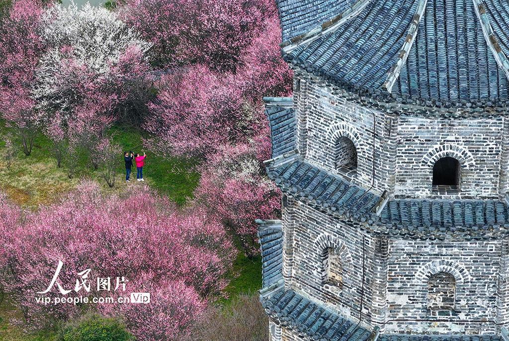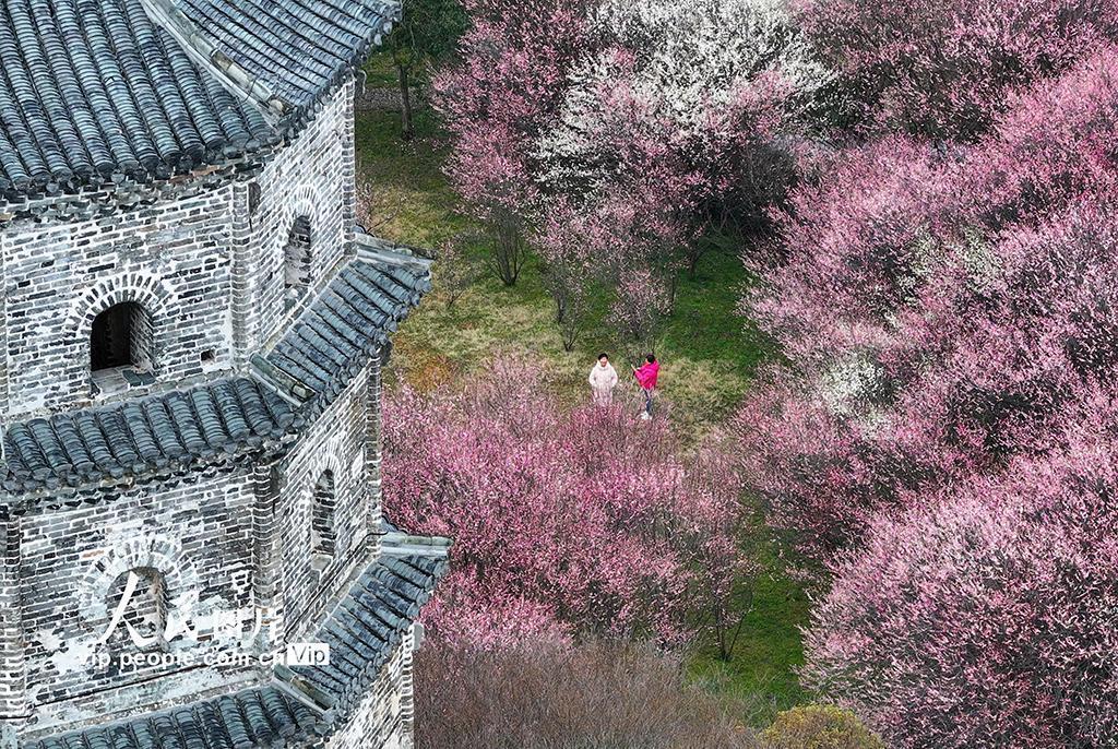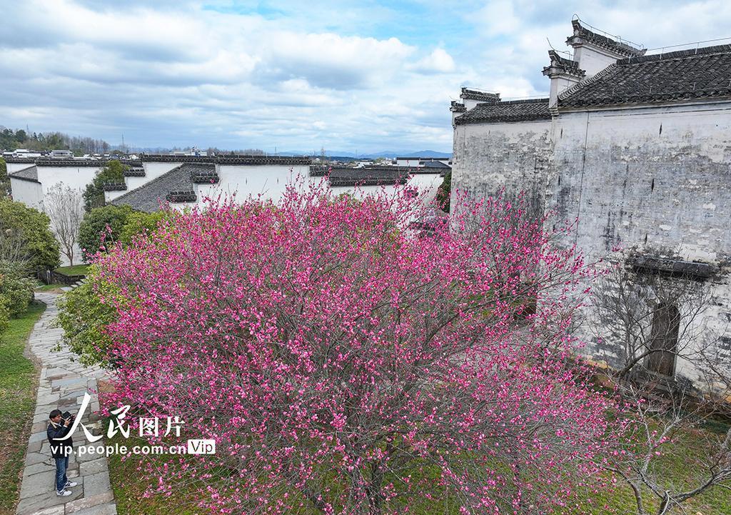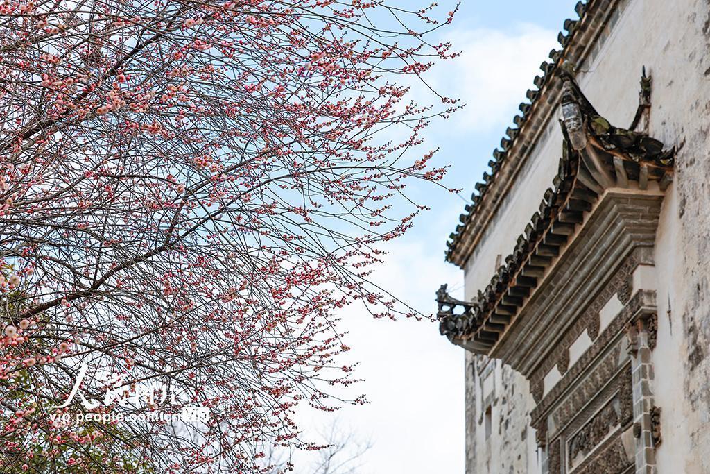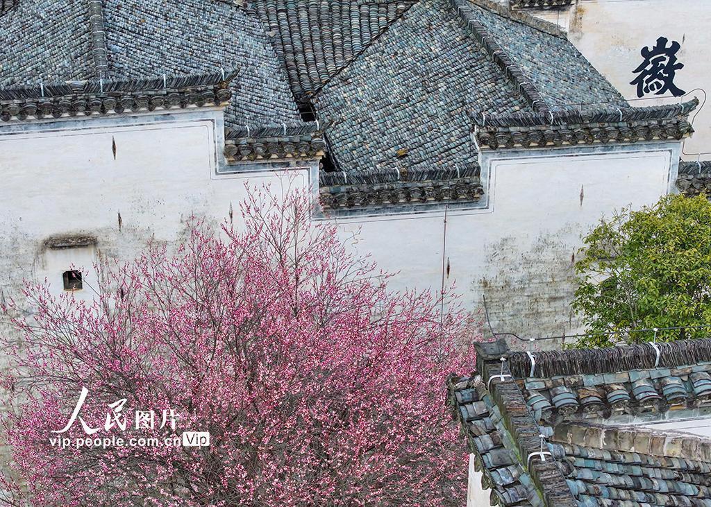 初春之际,安徽省黄山市徽州区的千年古村——潜口村,梅花竞相怒放,绚烂夺目,与古朴典雅的徽派古建筑交相辉映,构成了一幅幅动人心魄的画卷,吸引着四面八方的游客纷至沓来,踏青赏梅,共赴这场春天的盛宴。施亚磊摄(人民图片网)